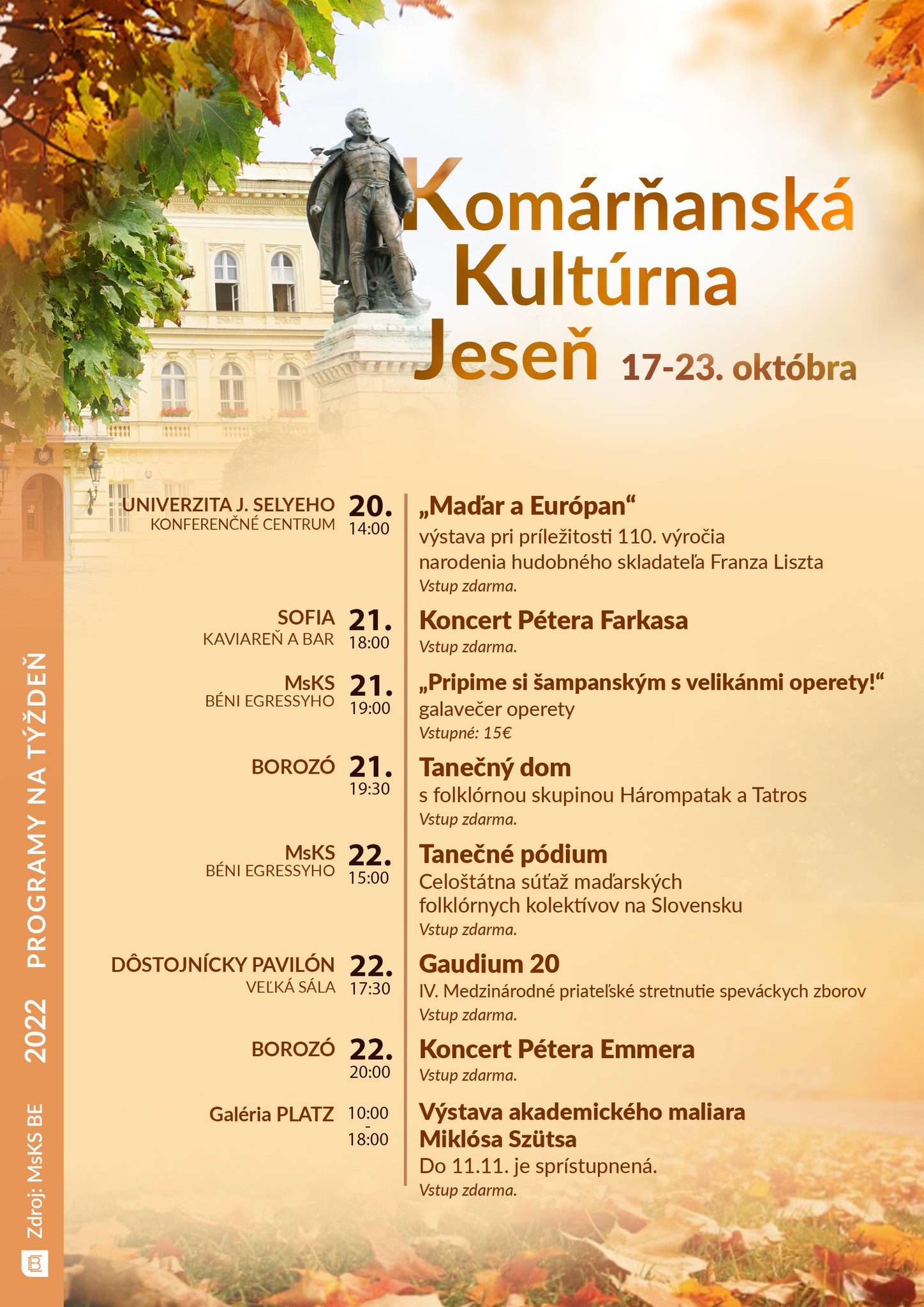 Komáromi Jazzklub – Komárňanský jazz klub BETTIKA SEPTET (koncert) 2022. október 28. (péntek) 19:00 28. októbra 2022 (piatok), 19:00 Egressy Béni Városi Művelődési Központ, Kiss Péntek József Kamaraterem, Komárom (SK) Mestské kultúrne stredisko Béni Egressyho, Komorná sála Józsefa Kiss Pénteka, Komárno Jegyár: 5€ A Bettika Quintet a jazz, a magyar népzene alapú világzene, a vers […]