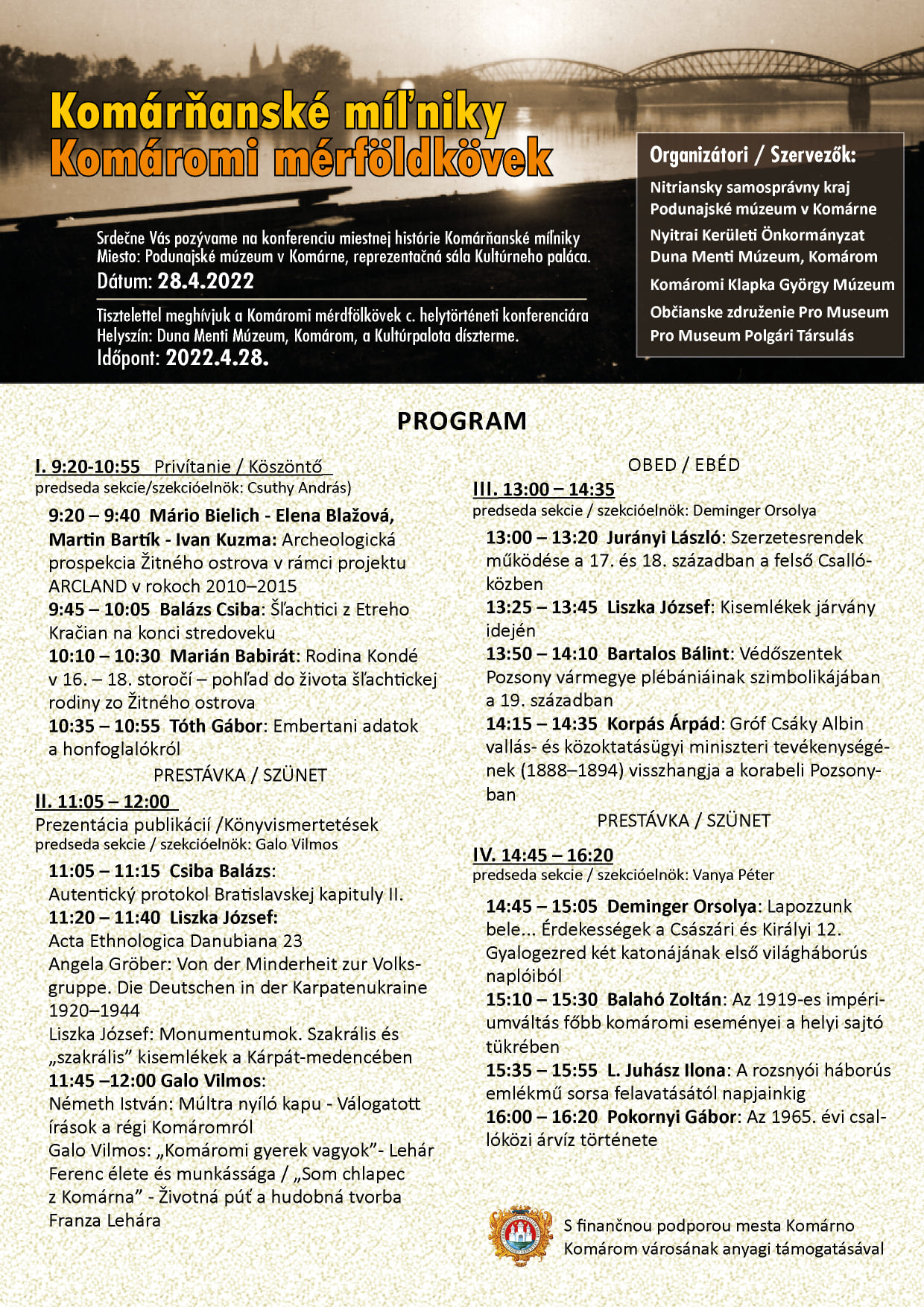 Veľké Javisko 16:00 – Pusztaszer 17:30 – José 19:30 – Jana Kirschner 21:30 – Ladánybene 27 Malé Javisko ÁPRILIS 30. , SZOMBAT : 15:00 – Árgyélus népzenekar Podrobný program kn-22-SK-1 30. APRÍL (sobota):07.00 XX. Čárda túra – Medzinárodná vytrvalostná cyklotúra (štart: Lodná ulica) info: www.csardatura.sk08.00 – 18.00 XXV. ročník medzinárodnej streleckej súťaže o Pohár generála […]